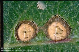 - Shot Hole: If shot hole fruiting structures are present in leaf lesions in the fall, the likelihood that shot hole will develop in the orchard the following spring is higher. Keep an eye out for shot hole fruiting structures in your orchard after fall rains begin. If fruiting structures are present, apply a foliar zinc sulfate nutritional spray in early November; this will speed up fall leaf drop and reduce inoculum.