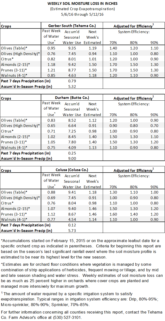 Northern Sac Valley Soil Moisture Loss Report – May 13, 2016 Home > Irrigation Mgmt > 2016 Et Reports Posted on May 24 2016 by Dani Lightle Last modified on April 11 2017