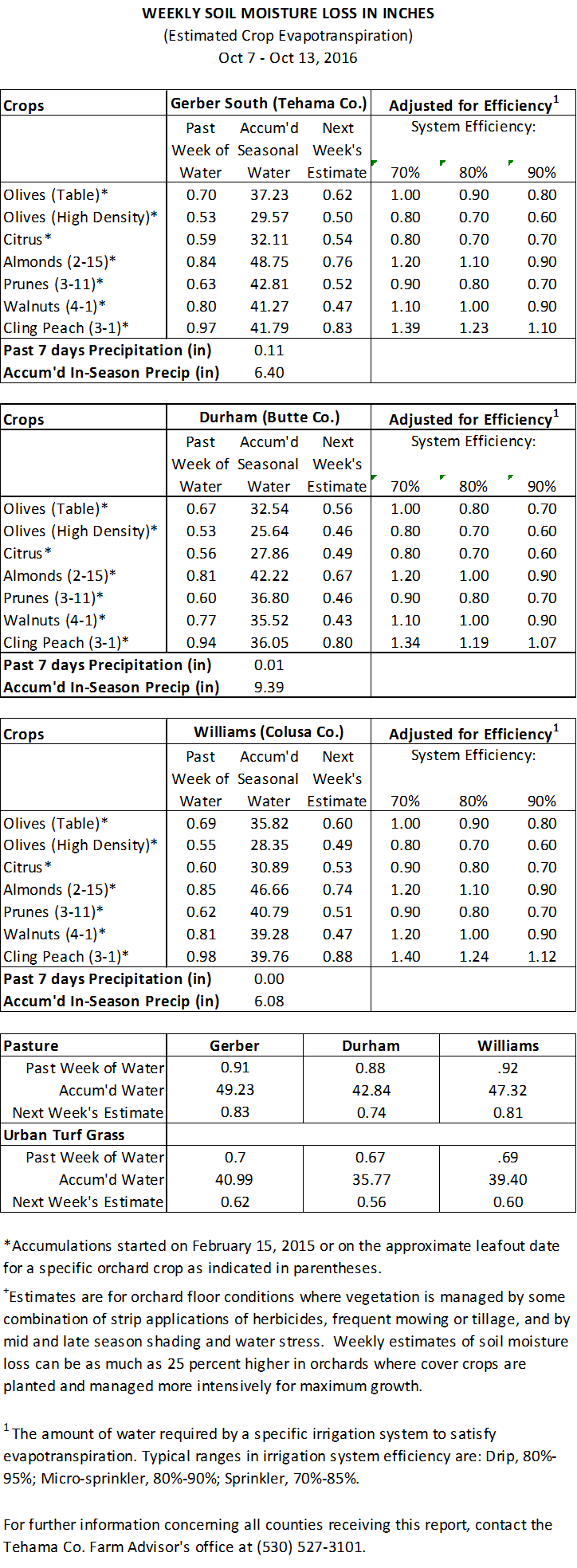 Northern Sac Valley Soil Moisture Loss Report – October 14, 2016 Home > Irrigation Mgmt > 2016 Et Reports Posted on October 14 2016 by Allan Fulton Last modified on April 11 2017