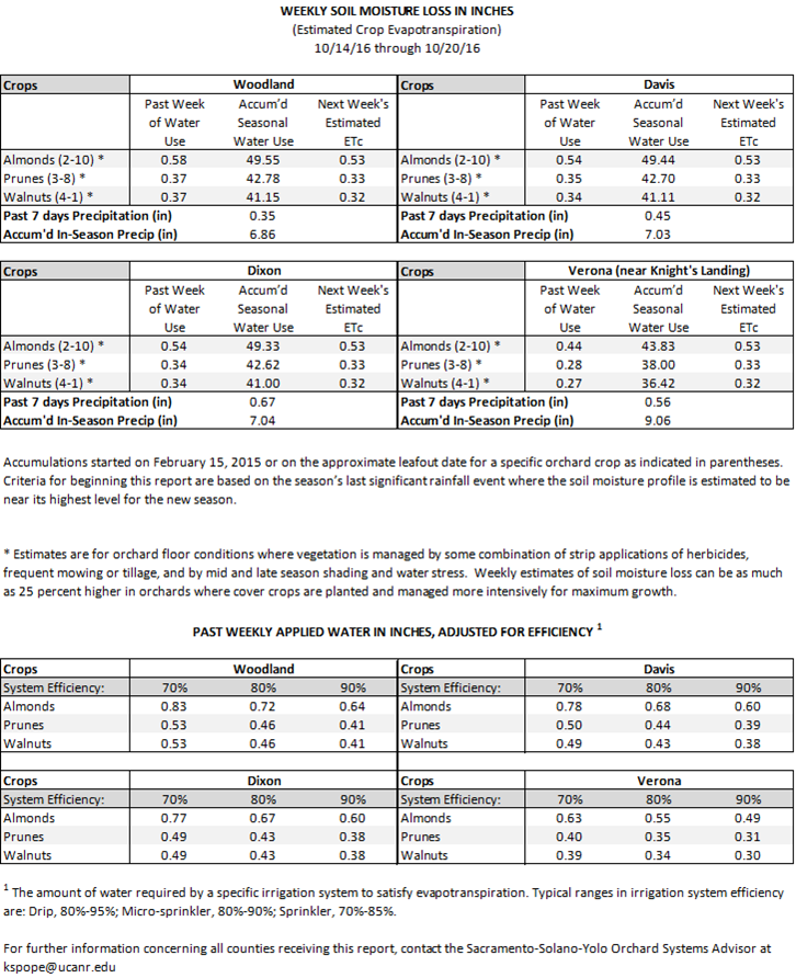 Southern Sac Valley Soil Moisture Loss Report – October 20, 2016 Home > Irrigation Mgmt > 2016 Et Reports Posted on October 21 2016 by Katherine Jarvis-Shean Last modified on April 11 2017