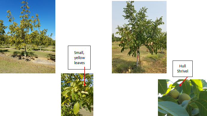 SWP levels can measure between -2 and -18 bars tension on the pressure chamber gauge in walnut. A measurement of -2 to -4 bars tension indicates no water stress and is more likely to be observed in the spring, when days are shorter, and weather is cooler (see figure 1). In orchards where irrigation management is intense enough to sustain SWP levels at -2 to -4 bars tension all season, there is tremendous risk of diseases that lead to earlier orchard decline. For more leaf symptoms of overwatered walnut trees, see: Field research suggests the ideal range in plant water status for walnut may be between -4 and -8 bars water tension. In general trees should recover to an average of -4 to -5 bars water tension after irrigation, and reach an average of about -8 bars before irrigation. This irrigation strategy should help achieve optimum irrigation in terms of tree health, nut production, and water and energy use. When walnut orchards are exposed to long periods where SWP levels reach -8 to -12 bars tension, growth may slow in younger orchards and take longer to come into full production. Older orchards are likely to have little or no shoot growth and nut yield and quality will be sub-par. When walnut orchards measure -14 to -18 bars tension for long periods of time, they are likely dying and production and quality will be poor.