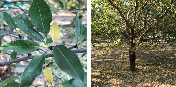 Field research suggests the ideal range in plant water status for almond is between -8 and -18 bars water tension. SWP potentials that range from -8 to -12 bars from March through mid-June will promote almond shoot growth and nut sizing. At the onset of hull split beginning in late June or early July, SWP levels ranging from -14 to -18 bars tension promote hull split and uniform nut maturity leading up to timely harvest. Recovering midday SWP levels back to -10 to -14 bars tension after harvest promotes bud development of next year’s crop. When almond orchards are exposed to long periods where SWP levels exceed -20 tension, young orchards will grow slowly and be slow to come into full production. Older orchards are likely to display increasing amounts of defoliation (figure 3), nut size will be smaller, and hull tights will be common. Field research where irrigation was purposely withheld for an entire season to simulate severe drought showed almonds may survive more than -60 bars water tension. However, when almond trees are this severely deprived of water, they will defoliate early and not produce any harvestable crop.