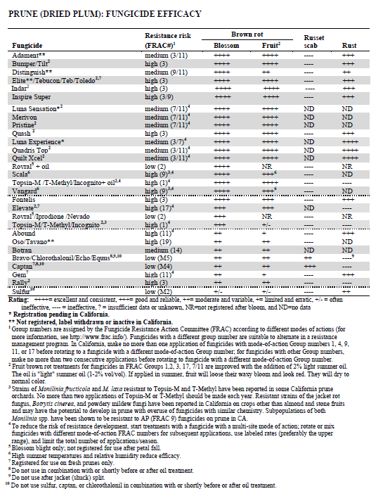 There is no guarantee that an effective fungicide will work forever, especially “single-site” fungicides that only target one chemical pathway. If a mutation develops a way around the blocked pathway, the fungicide may not work on that population. In a few Sacramento Valley orchards, brown rot is resistant to cyprodinil (Vangard®). You can help preserve fungicide choices and provide effective disease control by practicing good disease resistance management. Here are some steps to consider:
