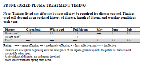 Proper timing of bloom sprays is crucial for control. The challenge is anticipating severe disease conditions. Location of the orchard (soil-type, water drainage, micro-climate effects of rivers, foot hills, etc.), type of irrigation system (high or low canopy wetness), history of disease at the orchard site (especially in the previous growing season), amount of expected precipitation (dews and rainfall) and expected temperatures all contribute to estimating the “disease pressure”.