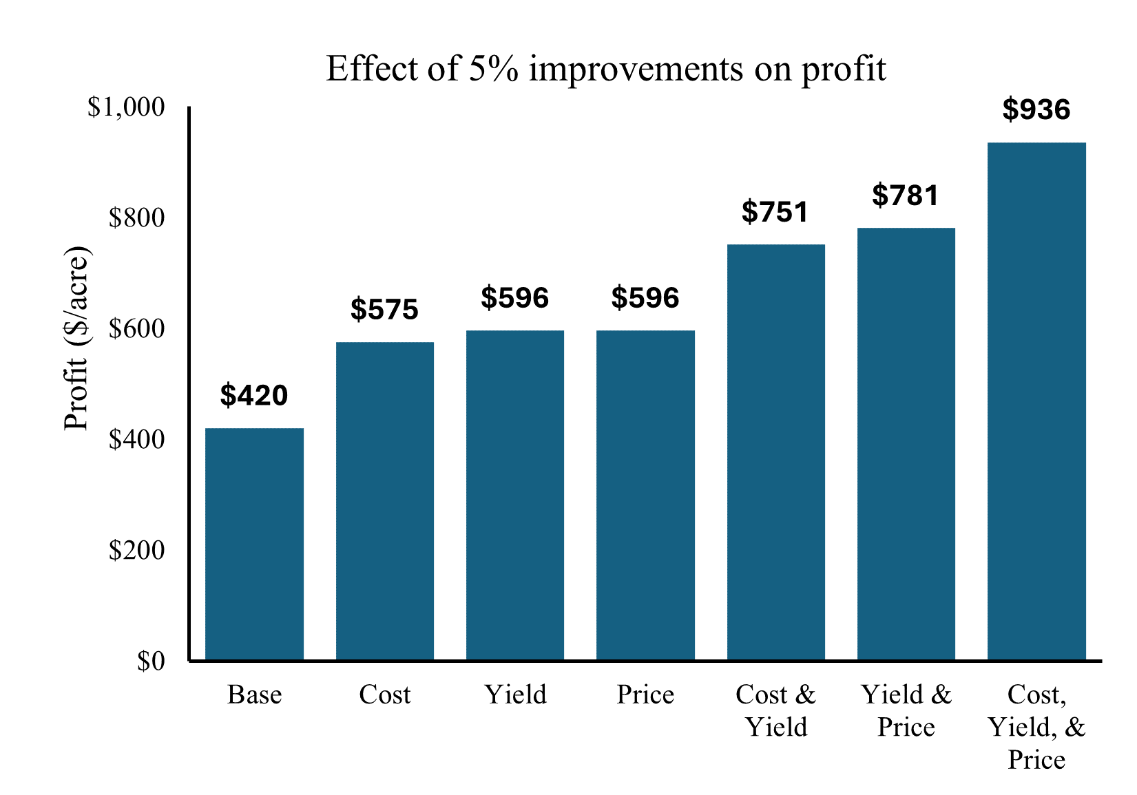 Adopting these proven cost saving and yield improvement practices for small changes can lead to significant gains. The 5% rule is a simple concept where growers should aspire to increase yield and price received by 5% and decrease cost by 5%. Figure 1 shows how 5% improvements in cost, yield, price, and their combinations affect profits. The example is based on an initial profit of $420/acre, which is determined by subtracting the base cost of $3,100/acre from the revenue, which is the product of the base yield (2,200 lb/acre) and price ($1.6/lb). A 5% decrease in cost results in a 37% profit increase, while a 5% improvement in yield or price leads to a 42% profit increase. If the price remains unchanged, but costs are reduced by 5% and yield increases by 5%, profit grows from $420/acre to $751/acre, representing a 79% increase. A combined 5% improvement in cost, yield, and price results in a 123% increase in profit.