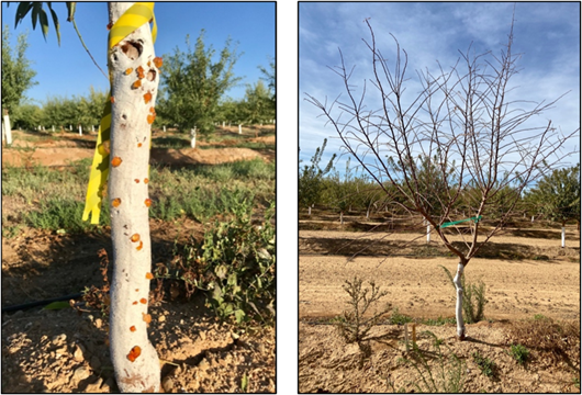 Figure. 1 Herbicide Damage in 2nd leaf almonds. Glufosinate + Glyphosate (1.5 + 2.75lbs/ac). Image on the left is trunk gummosis observed 5 weeks after treatment. Image on the right shows complete defoliation of the same tree 12 weeks after treatment.