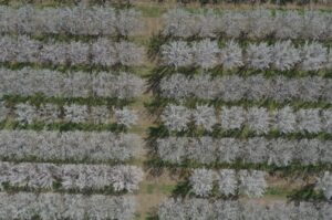 Photo 1: Drone photo of the UC Cooperative Extension almond variety trial at the CSU, Chico Farm. In the trial every other row is Nonpareil, and the other rows are 12 tree replicates of 29 almond varieties (credit: Conservation Irrigation Lab).
