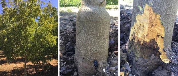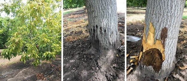 Phytophthora crown and root rots and Paradox canker disease are difficult to detect until the above- ground parts of the tree show symptoms, which usually appear at later stage of the infection especially in the summer time. These trees may have decreased yield and vigor for a few years before succumbing to the disease. Phytophthora disease can first be managed with an accurate diagnosis, and many types of cultural practices and chemical controls can be implemented for Phytophthora problems. Declining trees are characterized by chlorotic foliage as well as wilting, defoliation and eventual tree death. Trunks often expressed gumming together with crown rot symptoms (Fig. 1).