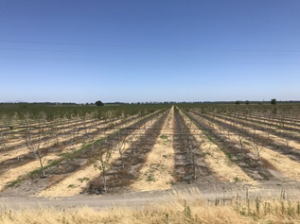 Photo 1. View of young Chandler orchard on RX1 rootstock from the Sacramento River levee on June 29, 2017. Photo: L. Milliron.