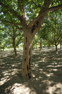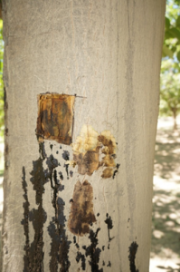 Photo 7. Bleeding cankers associated with aerial Phytophthora on river bottom walnut trees on August 8, 2017. Photo: J. Hasey.