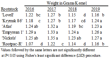 Nut size and yield.  ‘Nonpareil’ kernels from trees on ‘Rootpac-R’ were significantly smaller in two of the last four years than kernels from trees on all other rootstocks (Table 2); despite setting a smaller crop. Kernels from trees on ‘Krymsk 86’ and ‘Lovell’ were often of similar size while trees on ‘Empyrean 1’, ‘Nickels’, and ‘Atlas’ mostly produced kernels significantly larger than those produced on the other rootstocks. Thus, the significantly lower yield noted on ‘Rootpac-R’ rooted trees (Table 3) is a function of both smaller trees and small kernels even though they have a larger volume of irrigated soil with less competition.