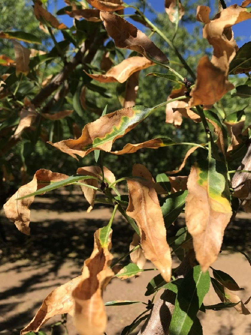 Beginning in late June, several PCAs and growers reported trees in almond orchards in the Sacramento Valley with symptoms like those of almond leaf scorch (ALS), a disease caused by the bacterium Xylella fastidiosa. This is the same bacteria that causes Pierce’s disease in grapes. In addition, ALS symptoms appeared far more widespread and severe at the Regional Almond Variety Trial at the California State University, Chico Farm where the disease was first confirmed in 2018 after appearing on only a handful of trees. UC farm advisors working with UC and USDA plant pathologists have begun a survey to confirm disease presence and improve understanding of the disease in the Sacramento Valley.