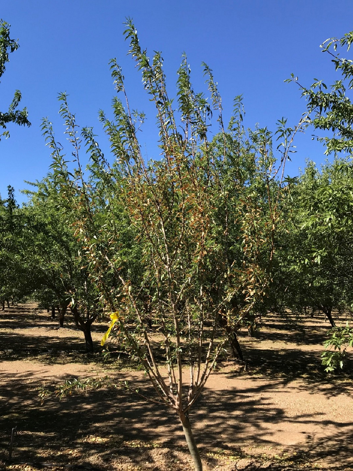 It is important to identify and mark affected trees while the scorched areas of the tree canopy contrast clearly with healthy green leaves. Once harvest begins, mites, dust, and drought stress combined with tree shaking often make signs of almond leaf scorch more difficult to detect.