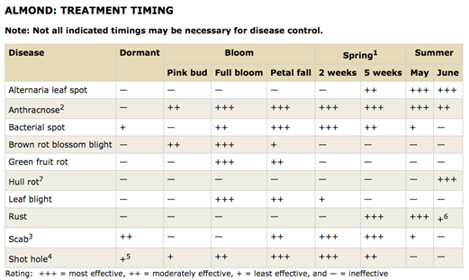 - Adjuvants may increase the potential toxicity of fungicides to honey bees, so it is best to adhere to a conservative approach and only put in the tank what is absolutely necessary. Under wet bloom conditions, additional bloom sprays may be warranted. Practice sound integrated pest management practices – treat only for those pathogens that are best controlled during bloom (see table below) and those you know are a potential threat in your particular orchard or block based on monitoring or history. The recently-updated UC IPM guidelines provide details on monitoring and treatment timings for key almond diseases.