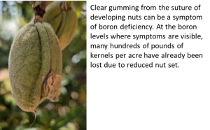 Boron is required for pollen tube development, so is necessary for effective fertilization and nut set in almonds. It also accumulates in the hull during nut development and is exported from your orchard in the form of hulls when you harvest. Having too little boron in your orchard directly affects yield, and therefore your bottom line.