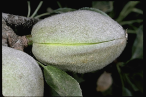 Early hull split, when the hull begins to open at the suture, is a don’t-want-to-miss timing in almond production. The crack in the hull does two things: releases nut volatiles so the navel orangeworm (NOW) female can find the nut (and lay eggs), and gives wound pathogens like Rhizopus and Aspergillus an opening to infect the hull. Spraying at the right time (b2 stage, see photo below) when hull split first begins (in the upper, southwest side of the tree) is critical to effective hull rot and NOW management throughout the orchard. Because it takes time to get across orchards, consider starting spraying just before nuts get to this stage.