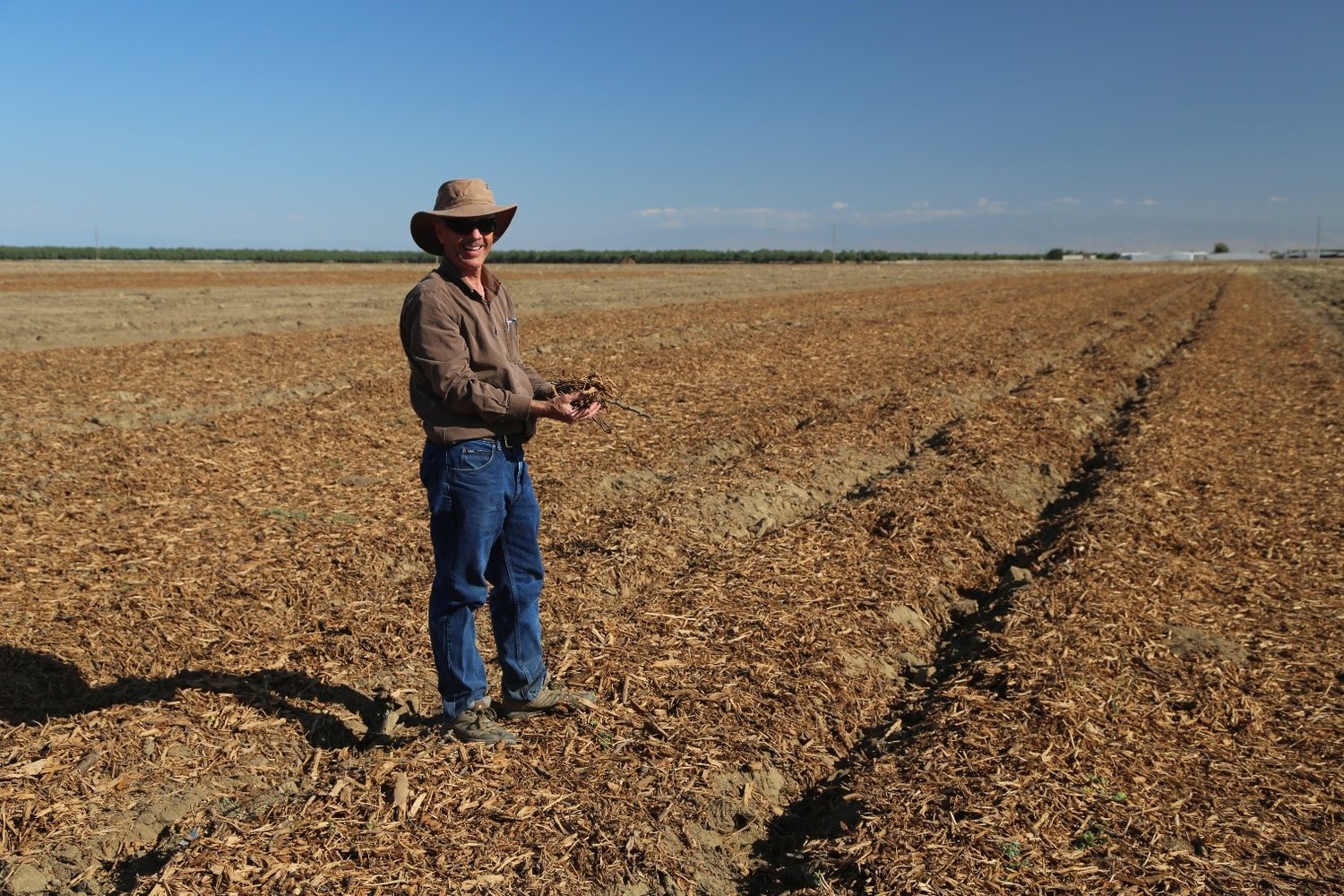 Dr. Greg Browne inspecting wood chips spread on the soil surface at approximately the same rate the trees were removed (65 tons per acre).