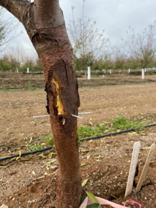 Photo 1. Sunken and darkened bark are damage symptoms from Glufosinate (e.g. Rely 280) trunk damage. The inserted nails were used as part of a research trial to determine bark growth. Photo credit: Drew Wolter. Glufosinate damage can also appear as small gum balls on the trunk. More pictures and keys for distinguishing it from Phytophthora, band canker, and bacterial canker: here.