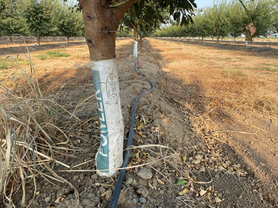 There is the concern that the paper carton will disintegrate before trunks are sufficiently hardened off to be resistant to herbicide injury. There needs to be more research on when you can safely remove cartons and not worry about trunks being damaged by herbicide. Former UCCE advisor David Doll (aka The Almond Doctor) suggests “…keeping them on through the summer of the second year as it provides protection for the late spring burn down while still giving an opportunity to remove them before debris and tree growth makes it more difficult.” In their research showing that paint did not protect trunks former UCCE intern Drew Wolter and advisor Dani Lightle found that nine weeks of hardening off (i.e. time between carton removal and herbicide application to the trunk) significantly reduced herbicide damage. Therefore, there are both orchard age (late in 2nd leaf) and hardening off (maximize time between carton removal and next herbicide application) components to preventing herbicide damage to young almond trunks. Of course, avoid self-inflicted herbicide injury by following best practices, including avoiding spraying near tree trunks when possible, considering a strip spray program without a green bark label warning, and avoiding spraying during windy conditions. More information on herbicide management in young orchards can be found in the article in this newsletter.