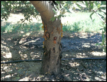 Band canker has been an increasing problem in young almond orchards in recent years. Some hot spot areas in Glenn County have suffered high damage and occasionally required the replanting of an entire pollenizer variety. Symptomatic trees have gumming on the trunk. In the first year of infection, gumming may show as a ring or band around the trunk (hence its’ common name), though multiple years of infections can result in a gummy mess up and down the entire length of the trunk. Cankers do not necessarily extend entirely around the tree, nor are they limited to the trunk. Pruning wounds elsewhere on the tree can be a point of infection and bands of gum can also occur on primary scaffolds.