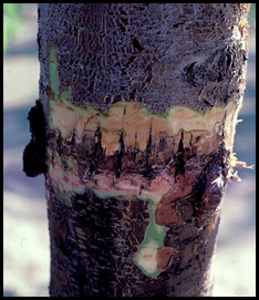 Tree showing band canker symptoms after infection events over multiple seasons. Photo: T. Michailiades.