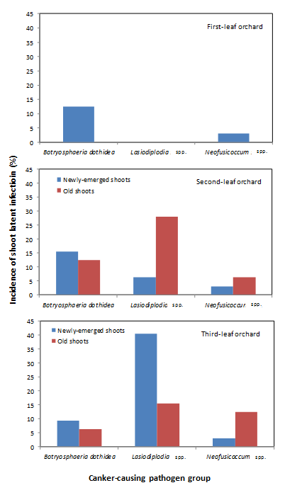Percent of shoots with latent infections of three different canker-causing genera of fungi. Latent infections were found in 1st leaf orchards, and the incidence of latent infections continued to increase with orchard age.