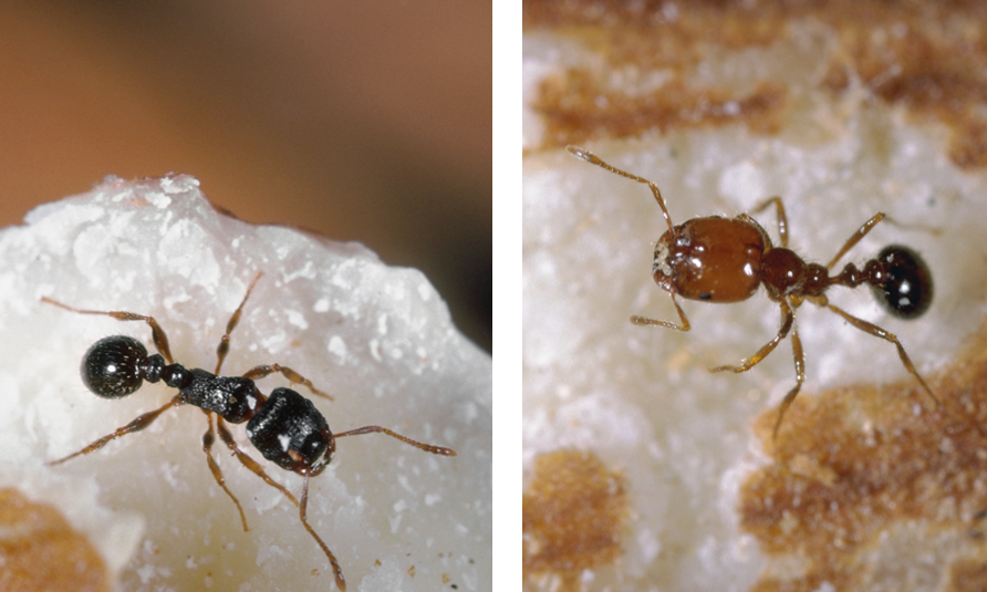 Photos 1& 2. Protein feeding ants. Pavement ants (left) are dark brown, and are covered in coarse hairs. Southern fire ants (right) are characterized by an amber head and thorax and a black abdomen.