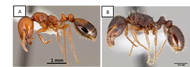 Fig. 1. Southern fire ant, Solenopsis xyloni (A) and Pavement ant, Tetramorium immigrans. Picture by April Nobile. AntWeb. Version 8.34. California Academy of Science. Accessed 12 June 2020.