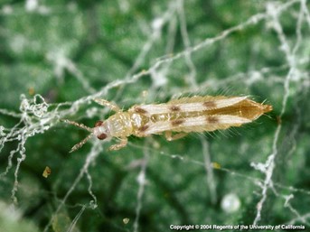 Photo 2. Sixspotted thrips, characterized by three dark spots on each of its two fringed wings (Photo: UC IPM).