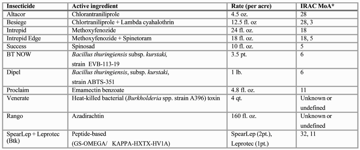 Note: Venerate was used only in 2020; BT NOW and SpearLep+Leprotec were used only in 2021. * IRAC (Insecticide Resistance Action Committee) assigns different numbers for insecticide active ingredients with varying modes of action (MoA). In general, avoiding the repeated spray of the insecticide(s) from the same IRAC group help to reduce the risk of insecticide resistance.