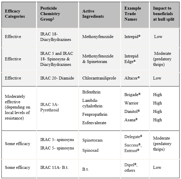 Know your insecticides. Insecticides differ in their mode of action, efficacies to NOW, and toxicity to beneficials (see Table 1). Knowing those facts can help select the best insecticide for a particular situation. Most of the insecticides labeled for NOW target newly hatched larvae and have some impacts on eggs. Some have effects on all stages. Insecticides applied for NOW management at hullsplit must kill the egg or larva before feeding damage occurs. Another difference among NOW insecticide is their potential effects on spider mite predators such as predatory mites and sixspotted thrips. Non-selective insecticides, in general, are more toxic to those beneficial than selective insecticides. Therefore, the tradeoff of using broad-spectrum insecticide should always be considered.
