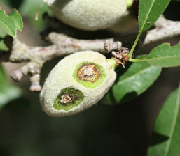 Photo 1. Anthracnose lesions and gumming on almond hull. Photo Credit: B. Holtz, University of California Cooperative Extension.