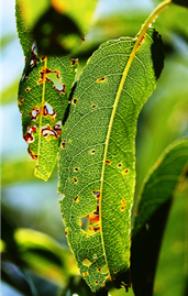 Leaf and shoot symptoms may occur, but are less common than fruit symptoms. Leaf lesions become chlorotic then necrotic, leaving irregular shaped holes (Photo 4). Twig lesions may develop on green shoots. High moisture conditions and warm temperatures (> 68°F) favor infection. Severe infections are most common with frequent periods of rainfall or irrigation during fruit development. Fritz is highly susceptible, whereas varieties such as Butte, Carmel, Monterey, Nonpareil, Padre, and Price generally exhibit less disease severity.