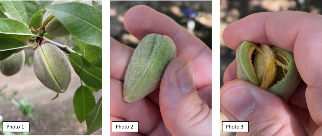 Hull split begins in the tree tops and progresses gradually to the lower interior of the canopy. Almonds are at hull split when they reach Stage 2C and show visible opening in the suture less than 3/8 inch (Photo 1). After hull split began, we recently observed nuts that appeared stalled at Stage 2B (Photo 2) for a week in highly water-stressed trees (trees in a different part of the orchard instrumented with FloraPulse sensors read between -19 and -21 bars, up to 16.5 bars drier than baseline). The percentage of nuts at hull split even appeared to decline in some trees during subsequent observations. A light squeeze applied to the ends of these 2B nuts caused the nuts to open at the suture, although the hull appeared to partially adhere to the shell (Photo 3). One day after the trees were irrigated nuts became more turgid and resumed hull split on their own. This was observed in nonpareils and test varieties at the CSU Chico variety trial.