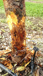 Photo. Failure to move microsprinklers away from the trunk led to trunk disease and tree death. Photo: D. Lightle.