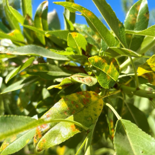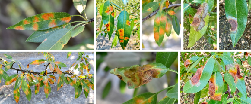Red leaf blotch (RLB), caused by the fungal pathogen Polystigma amygdalinum, which was first detected in California in the spring of 2024 has found its way to the Sacramento Valley. This summer the disease was confirmed in Yolo, Sutter, and Butte counties. In late April through mid-May, symptoms of RLB initiate as small, pale, yellowish spots or blotches that affect both sides of the leaves (Fig. 1). As the disease progresses, the blotches grow larger (0.4 to 0.8 in) and turn yellow orange with a reddish-brown center (Fig. 2). At advanced stages of disease development, leaves become necrotic, curl, and drop prematurely. Premature defoliation of trees can occur, thus reducing carbohydrate accumulation going into the next growing season, which can decrease future yields.