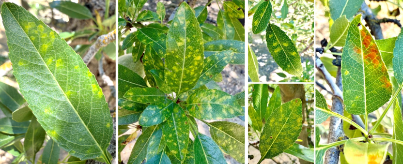 Figure 1. In late April through mid-May, symptoms of RLB initiate as small, pale, yellowish spots or blotches that affect both sides of the leaves. (Photos from early May, credits: Alejandro Hernandez and Florent Trouillas).