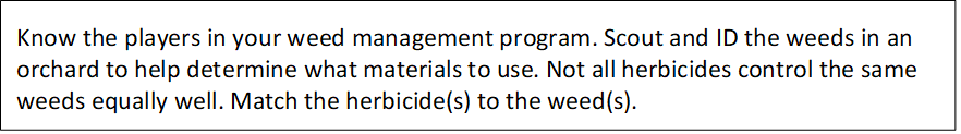 - Consider managing weeds in the row middles in young blocks so those areas don’t become a huge seed bank for the critical zones down the tree row. Cover crops can shade out summer weeds. Other strategies for killing young weeds in the row middle before they set seed include light tilling or herbicide spray(s).