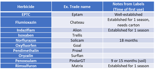 A pro-active yet often overlooked method to manage weeds in young orchards is the application of pre-emergent products. Pre-emergent herbicides control weed seedlings as they germinate halting the development of seedling shoots and roots, ultimately preventing emergence. These herbicides can provide residual control throughout the year if properly timed and applied. Applications can be made once in the winter or early spring going into summer and again in the fall to target warm and cool season species, respectively. Pre’s bind to organic matter and soil to limit leaching and mobility once applied to provide residual control. Clearing berms of leaf litter and skeletal remains of any resident vegetation from last season will help evenly distribute and incorporate the pre-emergent for optimal control. The majority of these products require between 0.25-0.75 inches of rain/irrigation for proper incorporation and effectiveness. Plantings that were made in fall can take advantage of winter and spring rains.