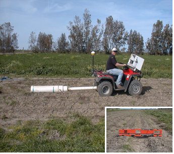 Figure 1. Two EM instruments are housed inside a PVC casing and towed behind an ATV with GPS system. The inset shows the orientation of the two instruments inside the PVC housing. One is horizontal (shallow) and the other is vertical (deep) mode.