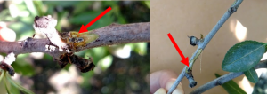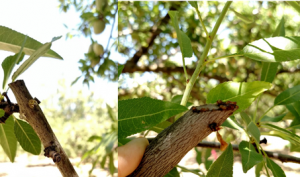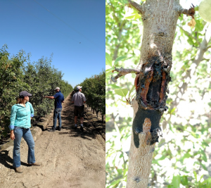 Dr. Florent Trouillas, one of our plant pathology specialists located at Kearney Ag Center, introduced us to a research project he is beginning to evaluate fungicides that may help prevent infection of pruning wounds by various canker-causing fungi such as Ceratocystis or Botryosphaeria. His study involved making smaller pruning cuts on a tree, treating with a fungicide, followed by inoculation of the pruning wound with fungal spores. Later this summer, he will examine each of the pruning cuts for signs of infection and attempt to re-isolate the pathogen. As seen in the above photos, some of the pruning wounds are beginning to show signs of gumming & disease.