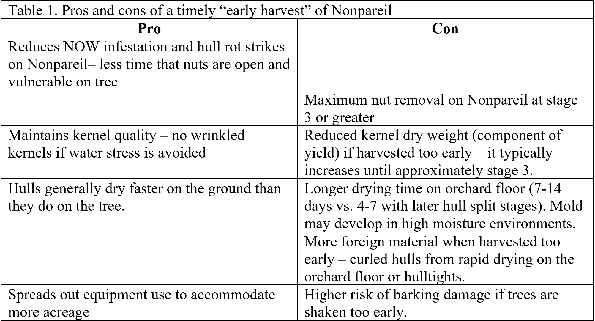There are many factors that influence almond harvest time, including equipment scheduling, weather, irrigation timing, NOW pressure, and the potential of an inshell premium with shaking at a later hull split stage. With all these things in consideration, it is important for growers to prioritize their goals for the crop. Growers must account for site-specific challenges whereby subtle changes in the date of shaking help to mitigate costly problems with pests and diseases, nut removal, and nut quality.