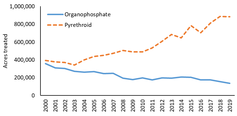 Figure 1. Annual acres treated with organophosphate and pyrethroid insecticides in the Sacramento Valley from 2000 to 2019. Source: California Department of Pesticide Regulation Pesticide Use Report data.