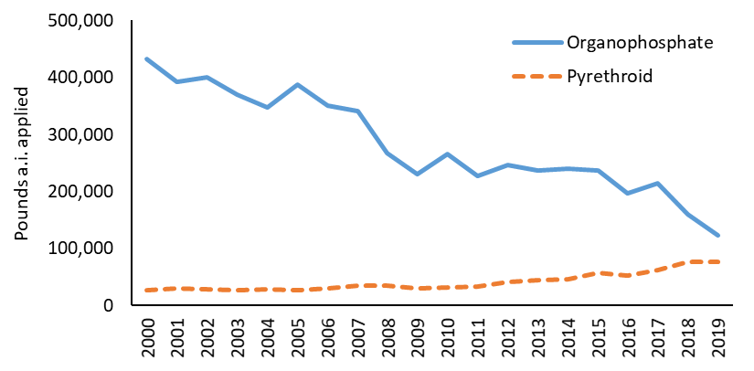 Figure 2. Annual pounds of active ingredient (a.i.) of organophosphate and pyrethroid insecticides applied in the Sacramento Valley from 2000 to 2019. Source: California Department of Pesticide Regulation Pesticide Use Report data.