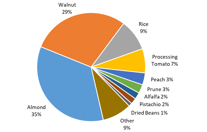Figure 3. Percentage of total pyrethroid use by commodity, 2015 to 2019, Sacramento Valley. Source: California Department of Pesticide Regulation Pesticide Use Report data.