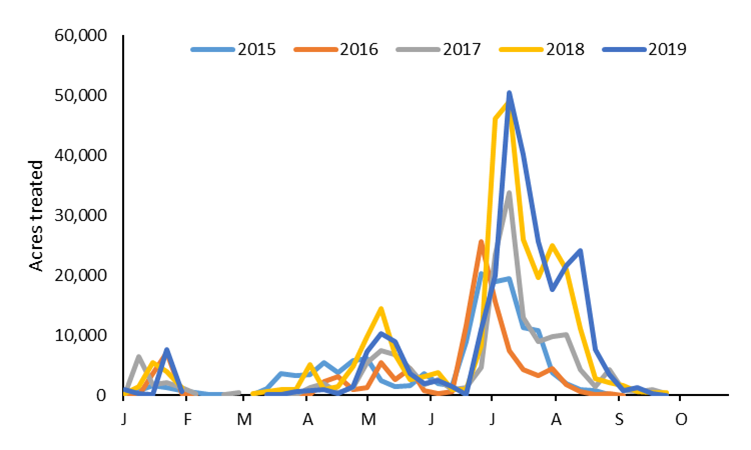 Figure 4. Almond acres treated weekly with pyrethroids, 2015 to 2019, Sacramento Valley. Source: California Department of Pesticide Regulation Pesticide Use Report data.