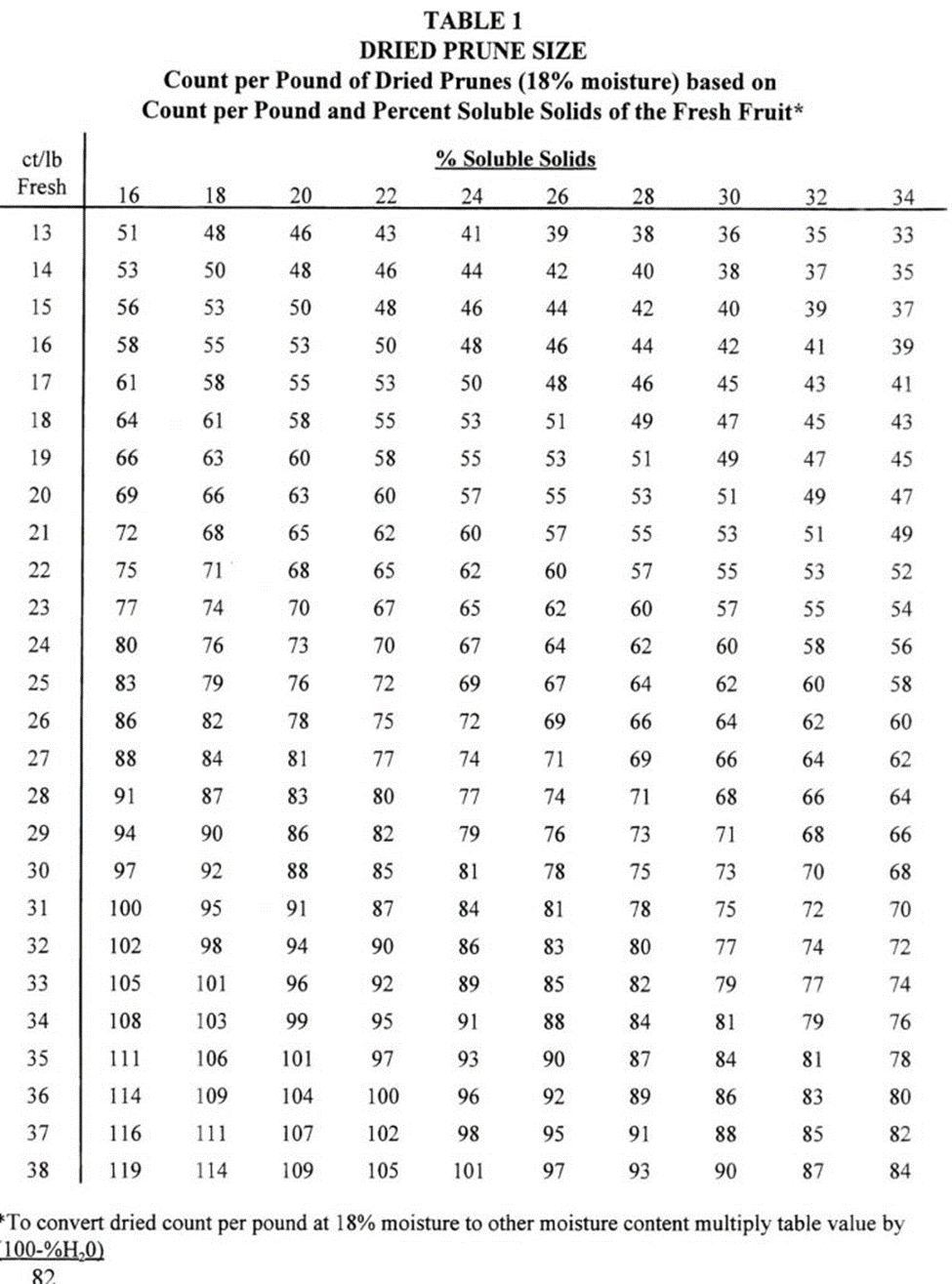 Field sizing is a lot like fruit thinning; there is a lot of art and experience mixed in with science. First, know what the crop looks like in your orchard. Use the Claypool Table (Table 1) to estimate the average dry fruit size in your orchard. It is very important to note that this table is not perfect and tends to be generous, predicting larger average dry fruit size for certain sugar values than actually were delivered. While it is a good estimate, the table results are anecdotally about 10% larger than what processors actually see after drying.
