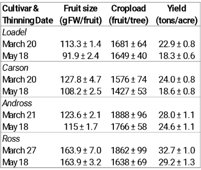 Table 1. Fruit yield data from four clingstone peach cultivars in commercial orchards near Kingsburg, CA that were thinned on two different dates in 1992. Data are means ± standard error for six 4-tree replicates per cultivar and thinning date, adapted from DeJong et al., 1992.