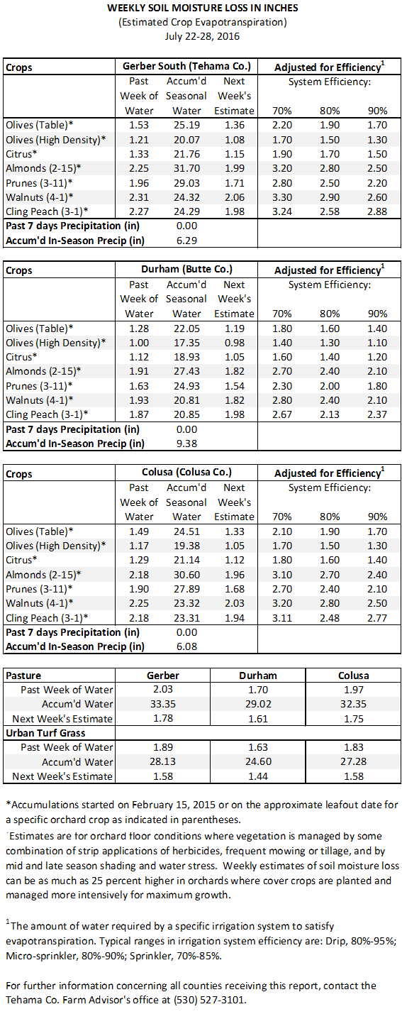 Northern Sac Valley Soil Moisture Loss Report – July 29, 2016 Home > Irrigation Mgmt > 2016 Et Reports Posted on July 29 2016 by Allan Fulton Last modified on April 11 2017