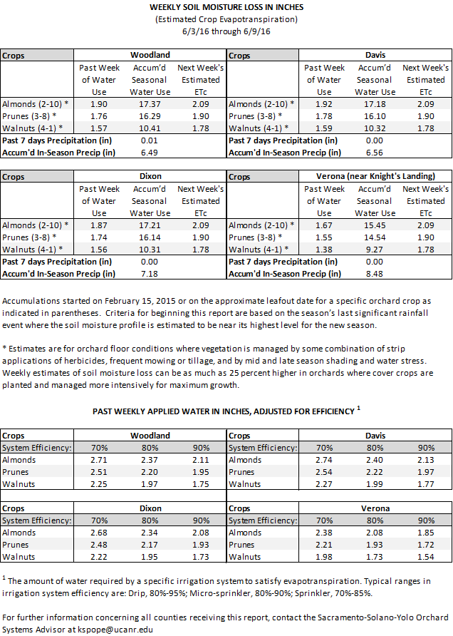 Southern Sac Valley Soil Moisture Loss Report – June 10, 2016 Home > Irrigation Mgmt > 2016 Et Reports Posted on June 10 2016 by Katherine Jarvis-Shean Last modified on April 11 2017